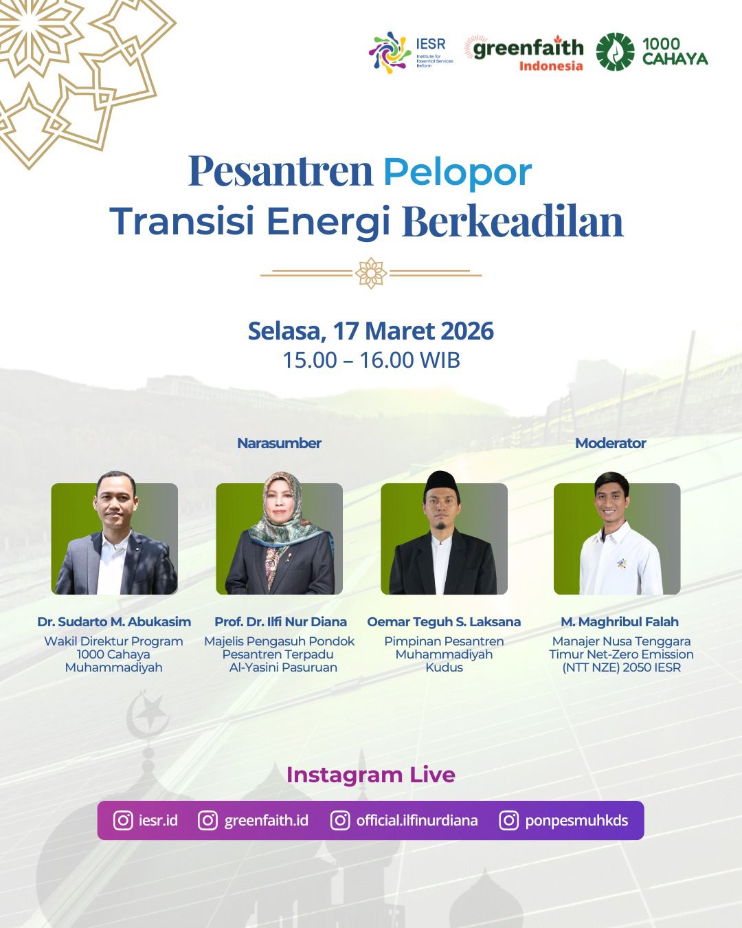 Tangkapan layar: Diskusi IG Live “Pesantren Pelopor Transisi Energi Berkeadilan”, 17 Maret 2026 Jakarta, 17 Maret 2026 – Pesantren dinilai memiliki peran penting dalam mendorong penggunaan energi bersih dan menjaga lingkungan. Tidak...